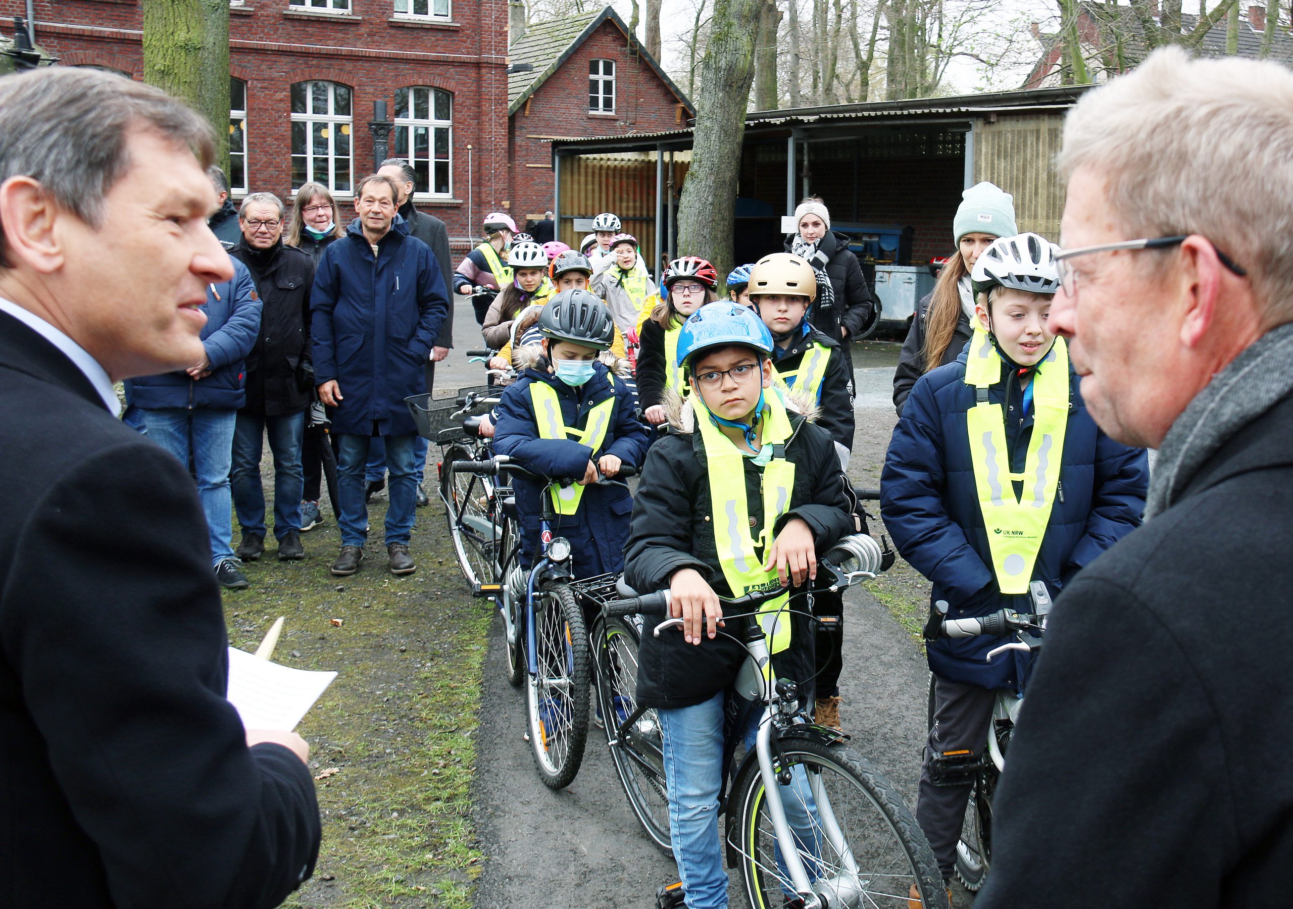 Zahlreiche Gäste waren zur Eröffnung der neuen Jugendverkehrs-schule gekommen. Auf dem Gelände hinter dem Heimatmuseum Unser Fritz versammelten sich die Schüler einer 4. Klasse der be-nachbarten Laurentiusschule wie Vertreter aus der Bezirksvertretung, der Verwaltung, der Politik, der Verkehrswacht und des ADFC.