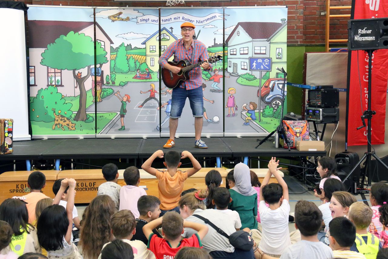 Zum Abschluss trat der Kinderliedermacher Rainer Niersmann mit seinen Liedern zum Verkehr und zur Verkehrserziehung vor den Kindern und dem Kollegium der Schule und unseren Mitarbeitern auf.